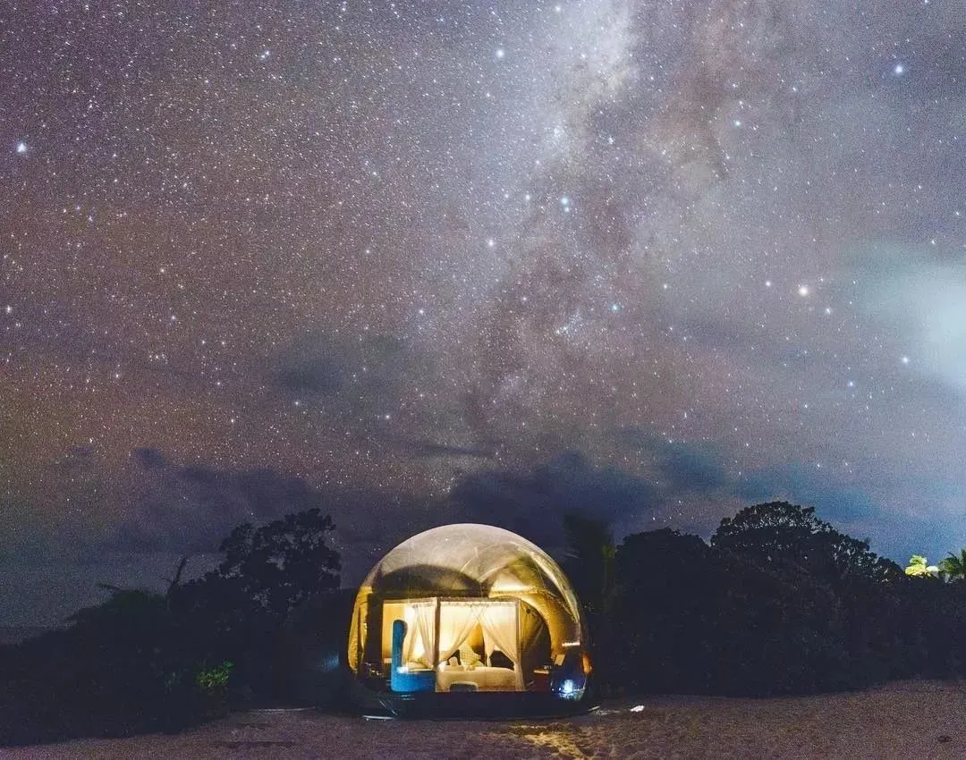 Instructions: Find a suitable smooth area free of rocks and debris. Pull out the tent from the storage bag and place the white floor on the ground. Install and start the hair dryer. Once the foam room is inflated (10 minutes), you use the hair dryer to maintain a constant light pressure and keep the shape of the foam. Relax and enjoy the experience of sleeping under the Milky Way, maybe you’ll catch a shooting star as you gaze at the ceiling. Foam tents are the ultimate outdoor abode. Make it your own outdoor luxury hotel or wherever you go. Take it camping, to a music festival, stargazing, or just leave it in your backyard for you to enjoy! -Perfect for lying under the universe -Great views, luxury accommodations on the beach -Useful for offices: meetings, product shows, trade shows, proposals, etc. -Easy to set up, cost effective greenhouse for gardeners! -Works well for your own meditation -We made from high quality, lightweight, rainproof material -Easy to carry and fold, if it rains, you will get an amazing view